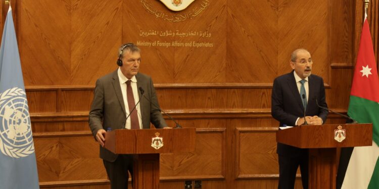 وأضاف الصفدي خلال مؤتمر صحفي عقد في مقر الوزارة الثلاثاء، مع المفوض العام لوكالة الأمم المتحدة لإغاثة وتشغيل اللاجئين الفلسطينيين (أونروا) فيليب لازاريني، أن الأردن مستمر ويقف بكل إمكانياته لتوفير الدعم اللازم لوكالة الأنروا في ظل الظروف المأساوية التي تزداد تفاقما جراء سياسات الاحتلال الإسرائيلي، مؤكدا على أن قدرة أونروا على القيام بواجبها وخدمة أهالي غزة ما تزال محدودة جدا بسبب المعوقات التي تفرضها قوات الاحتلال على الوكالة.