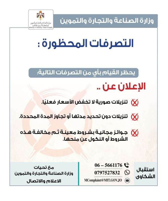 صدى الشعب – أكدت وزارة الصناعة والتجارة والتموين انه يحظر بموجب القانون الإعلان عن تخفيضات صورية (وهمية) على اسعار اي من السلع وعدم الالتزام بتحديد المدد اللازمة لإجراء العروض والتنزيلات.