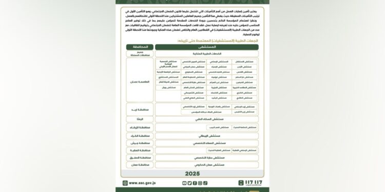 أوضحت المؤسسة العامة للضمان الاجتماعي أنها نشرت عبر موقعها الإلكتروني http://(Www.ssc.gov.jo)، قائمة الجهات الطبية الجديدة المعتمدة لغايات الاستفادة من خدمة العلاج الفوري لإصابات العمل.