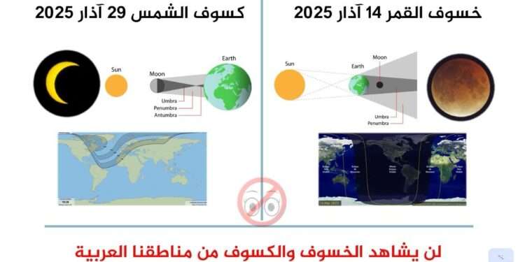 قالت المدربة الفلكية دلال خالد اللالا، من الاتحاد العربي لعلوم الفضاء والفلك أن شهر آذار الحالي سيشهد ظاهرتين فلكيتين مميزتين، وهما خسوف القمر في ١٤ الجاري وكسوف الشمس في ٢٩، حيث ستكونان مرئيتين في بعض دول العالم، لكنهما لن تكونا مشاهدتين في الدول العربية.