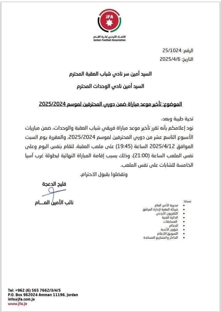 صدى الشعب – قرر اتحاد كرة القدم تأخير موعد مباراة شباب العقبة والوحدات ضمن الأسبوع الـ19 من دوري المحترفين، لتقام عند الساعة 9 مساء السبت، على ملعب العقبة بدلا من الساعة 7:45 كما كان مقرراً سابقاً.