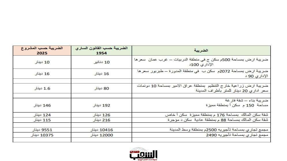 وتصبح الضريبة المفروضة على بناء شقة سكنية فارغة مساحتها 150 مترا مربعا (فئة أ) بمنطقة مميزة، 146 دينارا أردنيا في القانون الجديد، بعد أن كانت 192 دينارا في القانون الساري حاليا.