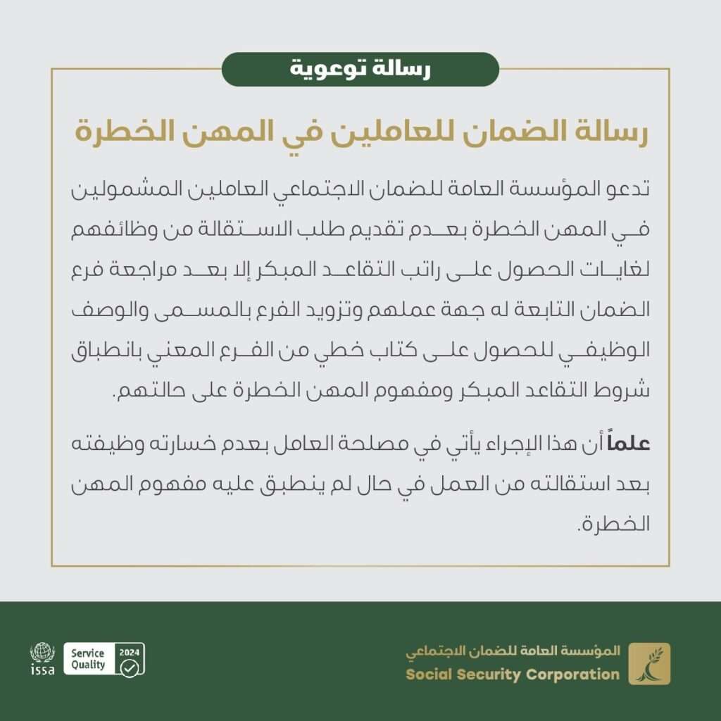 وطالبت المؤسسة في بيان صحفي صادر عن مركزها الإعلامي كافة المؤمن عليهم من المشمولين في نظام المهن الخطرة واستكملوا شروط استحقاق راتب التقاعد المبكر إلى ضرورة مراجعتها أولاً من خلال فرع الضمان التابعة له جهة عملهم وتزويد الفرع بالمسمى والوصف الوظيفي للتحقق من صحة شمولهم والحصول على كتاب خطي من الفرع المعني بمدى انطباق شروط التقاعد المبكر ومفهوم المهن الخطرة على حالتهم، مبينة أن هذا الإجراء يأتي في مصلحة العامل بعدم خسارته وظيفته بعد استقالته من العمل في حال لم تنطبق عليه شروط استحقاق الراتب ضمن المهن الخطرة.