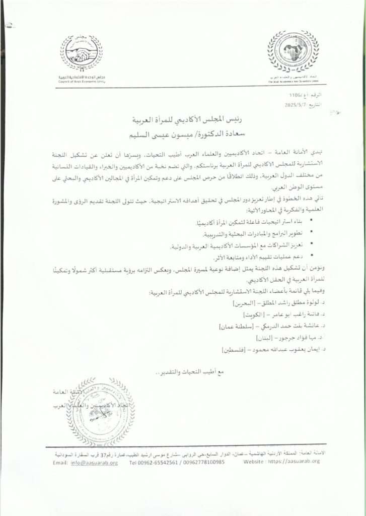 صدى الشعب – بناءً على القرار الصادر عن الأمانة العامة لاتحاد الأكاديميين والعلماء العرب، تم الإعلان عن تشكيل اللجنة الاستشارية العليا للمجلس الأكاديمي للمرأة العربية، وذلك في خطوة محورية تهدف إلى ترسيخ البنية المرجعية للمجلس وبلورة توجهاته الفكرية على المستوى العربي.
