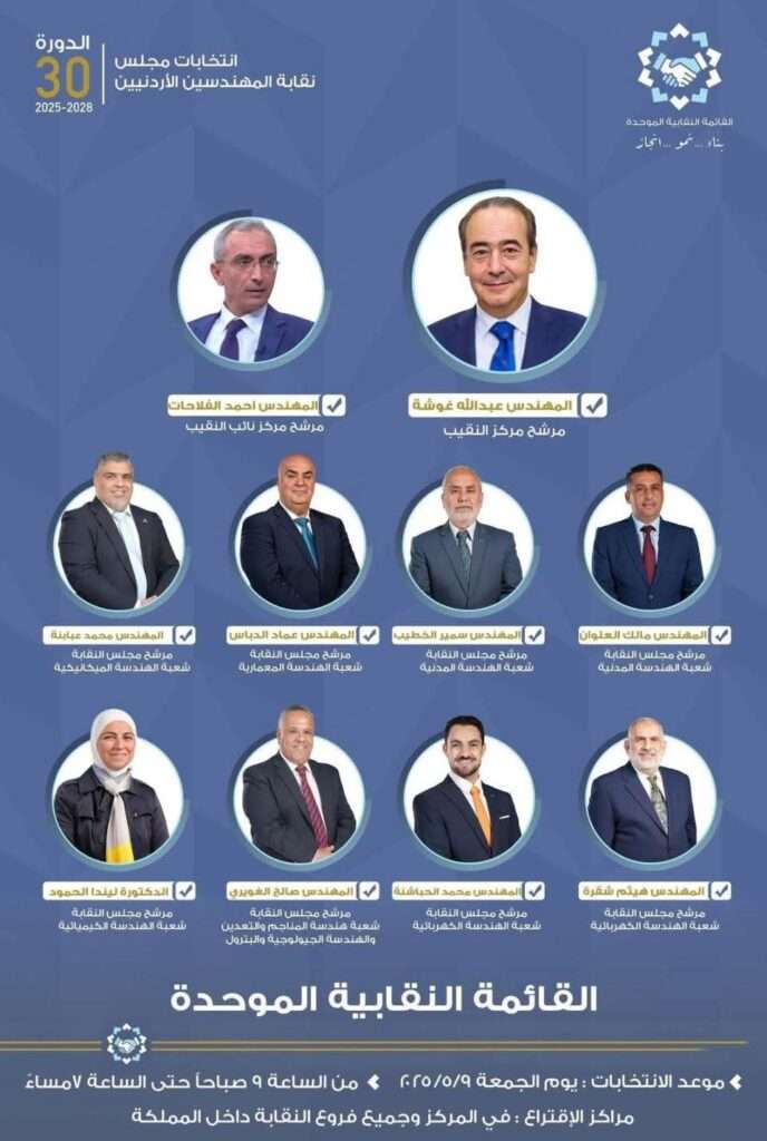 وفاز غوشة، بمجموع أصوات بلغ 8934، فيما فاز المهندس أحمد الفلاحات بمركز نائب النقيب وبمجموع أصوت بلغ 8605، للدورة الثلاثين للأعوام 2025- 2028.