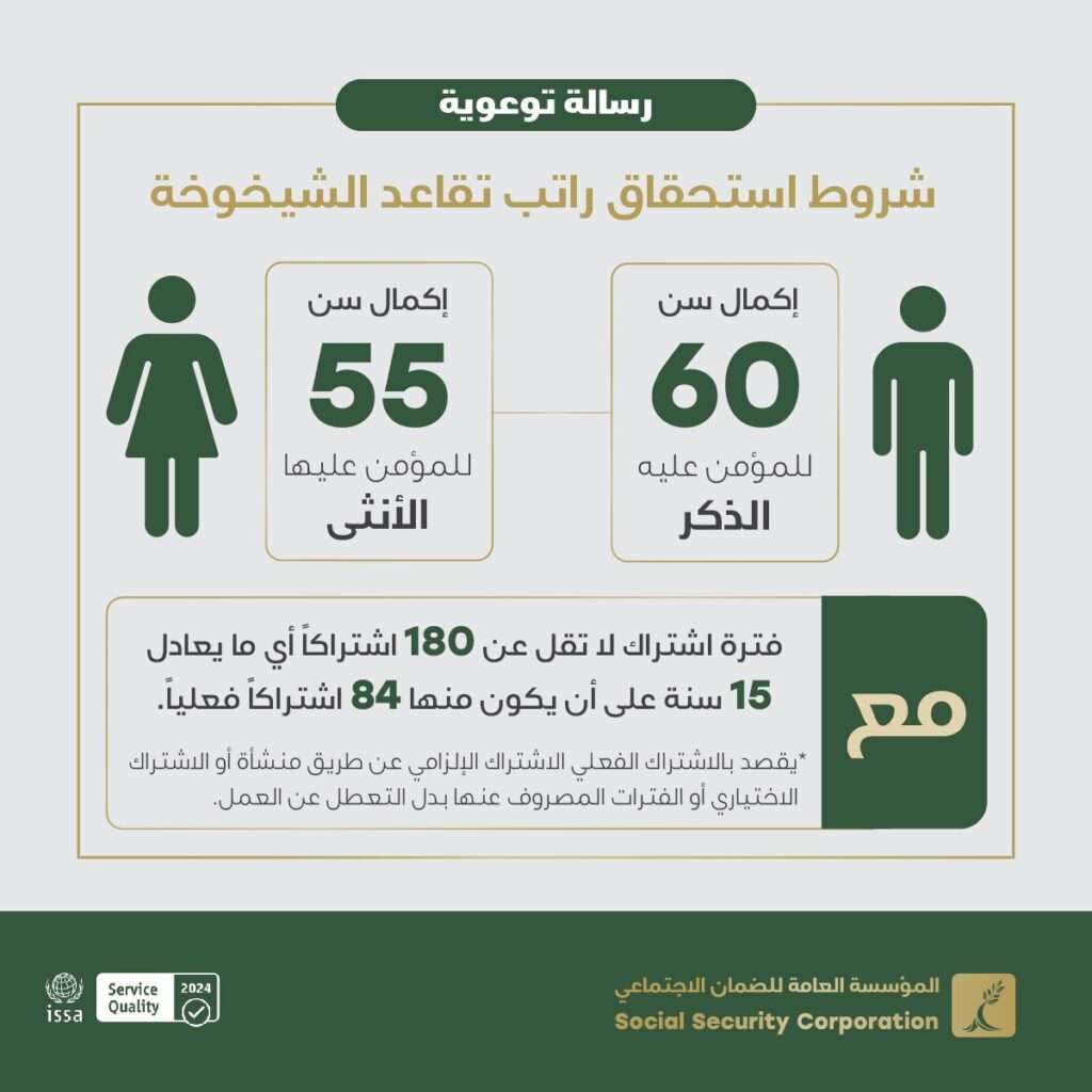 وأوضحت المؤسسة أن شروط استحقاق راتب تقاعد الشيخوخة هي إكمال سن الستين بالنسبة للمؤمن عليهم الذكور وإكمال سن الخامسة والخمسين بالنسبة للمؤمن عليهن الإناث مع مدة اشتراك بالضمان لا تقل عن (180) اشتراكاً أي ما يعادل (15) سنة على أن يكون من ضمنها (84) اشتراكاً فعلياً أي ما يعادل (7) سنوات، ويُقصد بالاشتراك الفعلي (الاشتراك الإلزامي من خلال منشأة أو الاشتراك الاختياري أو الفترات المصروف عنها بدل التعطل عن العمل).