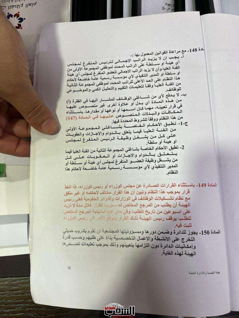 (العصفورة) نفسها من أحضرت معها (قصاصة) للتشريعات التي تتحدث عن (صلاحيات) رئيس هيئة الخدمة و الإدارة العامة و قالت مشيرة بأن ما كُتب بـ(اللون الأحمر) و تحت المادة (149) و يلي هذه السطور يحتم على النهار التدخل، و ختمت بوضع الصفحة كاملةً على مكتب (كواليس) ثم غادرت مذكرة أن لـ “للحديث بقية“