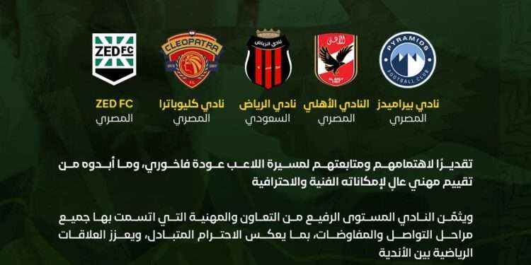 صدى الشعب – يتقدم نادي الحسين الرياضي, ممثلاً برئيسه المهندس عامر أبو عبيد, بخالص الشكر والتقدير إلى كل من: نادي بيراميدز المصري, النادي الأهلي المصري، ونادي الرياض السعودي، ونادي سيراميكا كليوباترا المصري، ونادي ZED المصري، تقديرًا لاهتمامهم ومتابعتهم لمسيرة لاعب النادي عودة فاخوري، وما أبدوه من تقييم مهني عالٍ لإمكاناته الفنية والاحترافية.