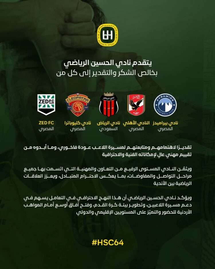 صدى الشعب – يتقدم نادي الحسين الرياضي, ممثلاً برئيسه المهندس عامر أبو عبيد, بخالص الشكر والتقدير إلى كل من: نادي بيراميدز المصري, النادي الأهلي المصري، ونادي الرياض السعودي، ونادي سيراميكا كليوباترا المصري، ونادي ZED المصري، تقديرًا لاهتمامهم ومتابعتهم لمسيرة لاعب النادي عودة فاخوري، وما أبدوه من تقييم مهني عالٍ لإمكاناته الفنية والاحترافية.
