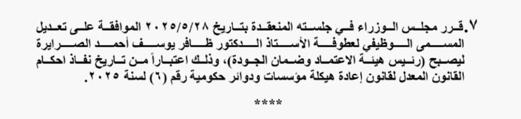 صدى الشعب – كما انفردت (صدى الشعب) قرر مجلس الوزراء، تغيير المسمى الوظيفي لرئيس هيئة اعتماد التعليم العالي، الأستاذ الدكتور ظافر الصرايرة، ليصبح رئيس هيئة الاعتماد و ضمان الجودة، بعد مدمج هيئة التعليم مع هيئة و تطوير المهارات المهنية والتقنية تحت المسمى الجديد (هيئة الاعتماد و ضمان الجودة).