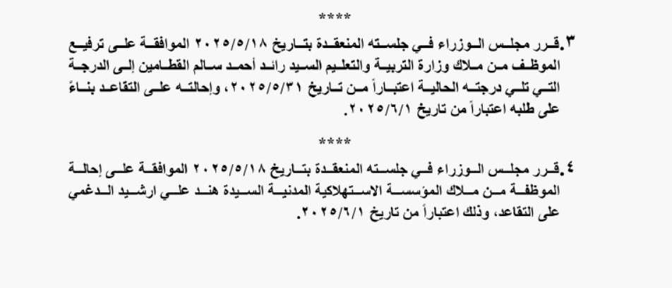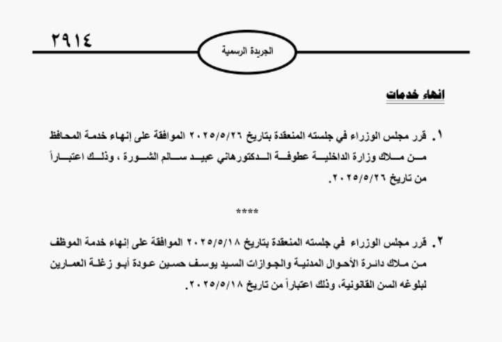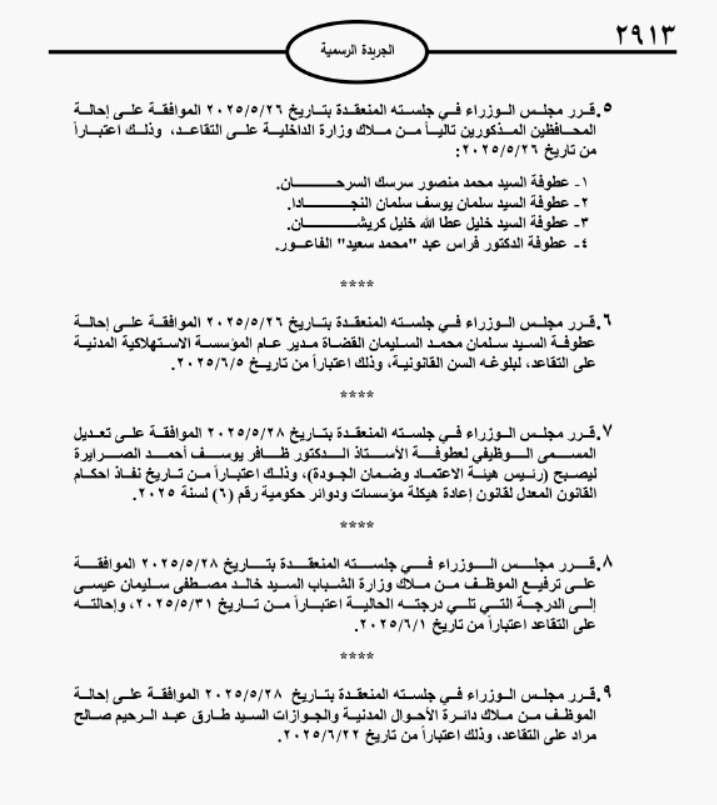 صدى الشعب - قرر مجلس الوزراء إحالة عشرات الموظفين الحكومين للتقاعد و إنهاء خدمات آخرين من مختلف المؤسسات و الوزارات:
