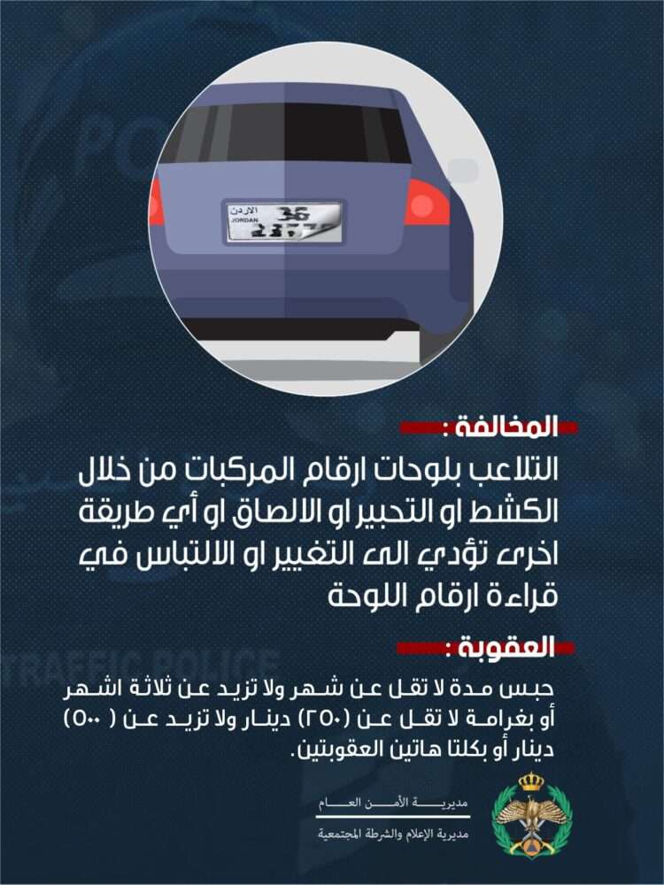 وأشارت إلى أن قانون السير المعدل ينص على أن التلاعب بلوحات أرقام المركبة يُعد مخالفة جسيمة، ويعاقب مرتكبها بالحبس مدة لا تقل عن شهر ولا تزيد على ثلاثة أشهر، أو بغرامة مالية لا تقل عن 250 ديناراً ولا تزيد على 500 دينار، أو بكلتا العقوبتين معاً