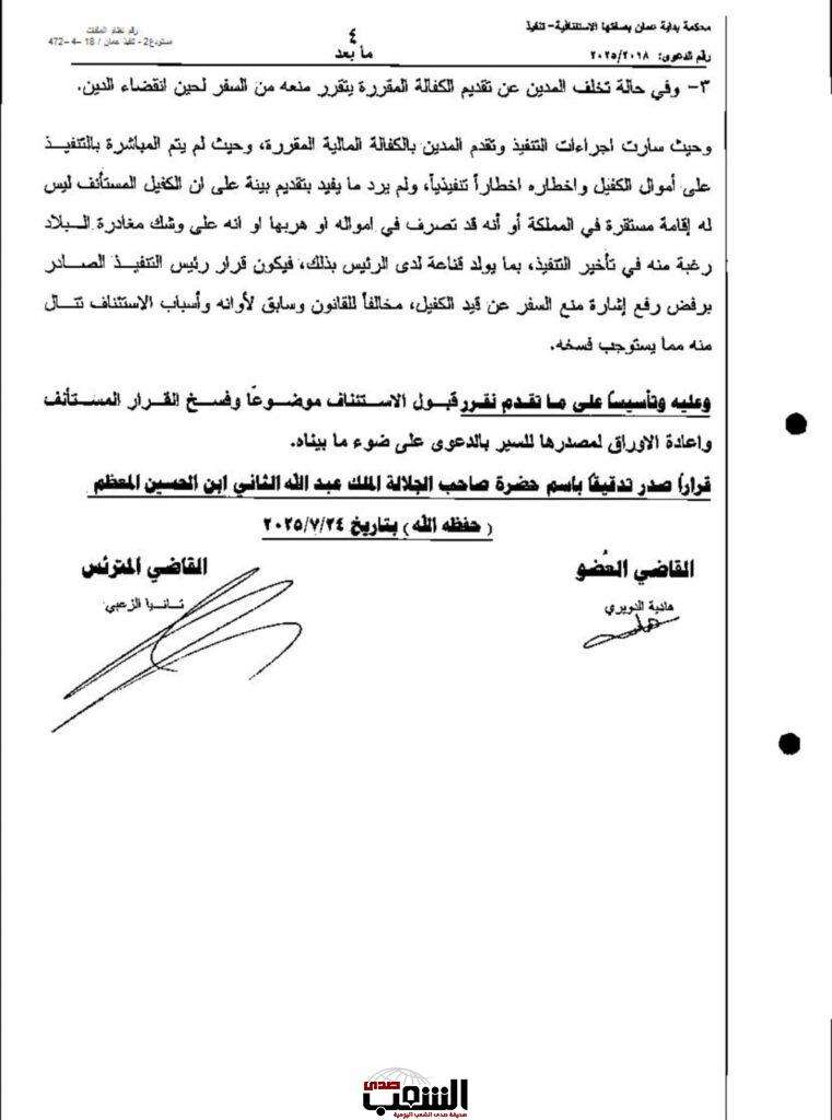 في خطوة تؤكد التزام القضاء الأردني بحماية الحقوق الدستورية للمواطنين، أصدرت محكمة استئناف عمان بصفتها الاستئنافية المؤقتة، قراراً يقضي برفع إشارة منع السفر التي صدرت بحق أحد المواطنين، بعد أن تبين أن القرار السابق لم يكن معللاً قانونياً، ولا يستند إلى ما يبرر تقييد حرية التنقل.