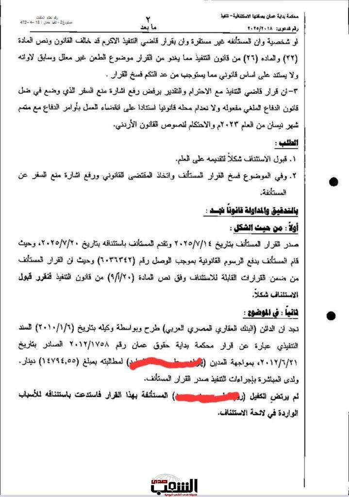 وجاء القرار بعد استئناف قدمه المحامي طارق الملكاوي، الذي أوضح أن المحكمة أخذت بعين الاعتبار انتهاء العمل بقانون الدفاع، وغياب أي مسوغات قانونية تُجيز منع السفر في الحالة المستأنفة، إضافة إلى تأكيدها على ضرورة التزام الجهات القضائية بنصوص قانون التنفيذ، خاصة ما ورد في المادة 26 بشأن اشتراط توافر مبررات قانونية واضحة لمنع السفر.