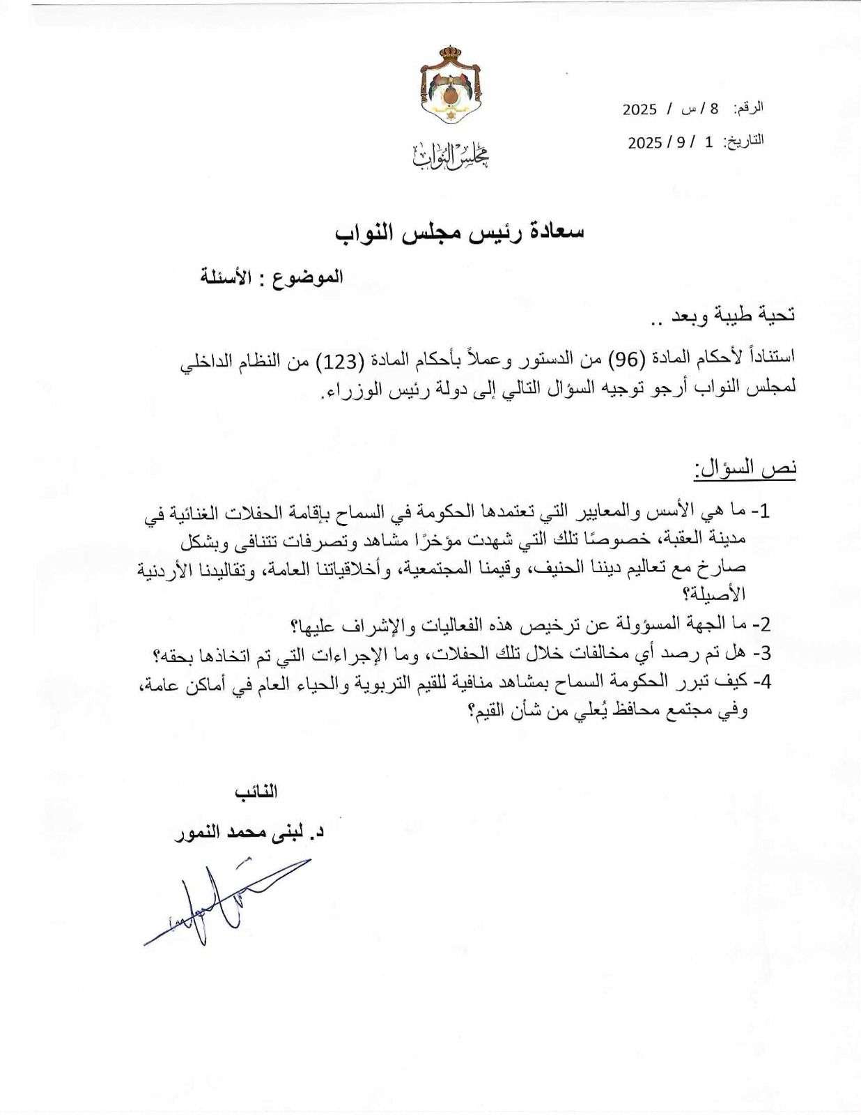 وجهت النائب عن محافظة العقبة لبنى النمور سؤالا نيابيا للحكومة حول إقامة الحفلات الغنائية بالعقبة والأسس والمعايير التي يتم اعتمادها للسماح بإقامة الحفلات الغنائية