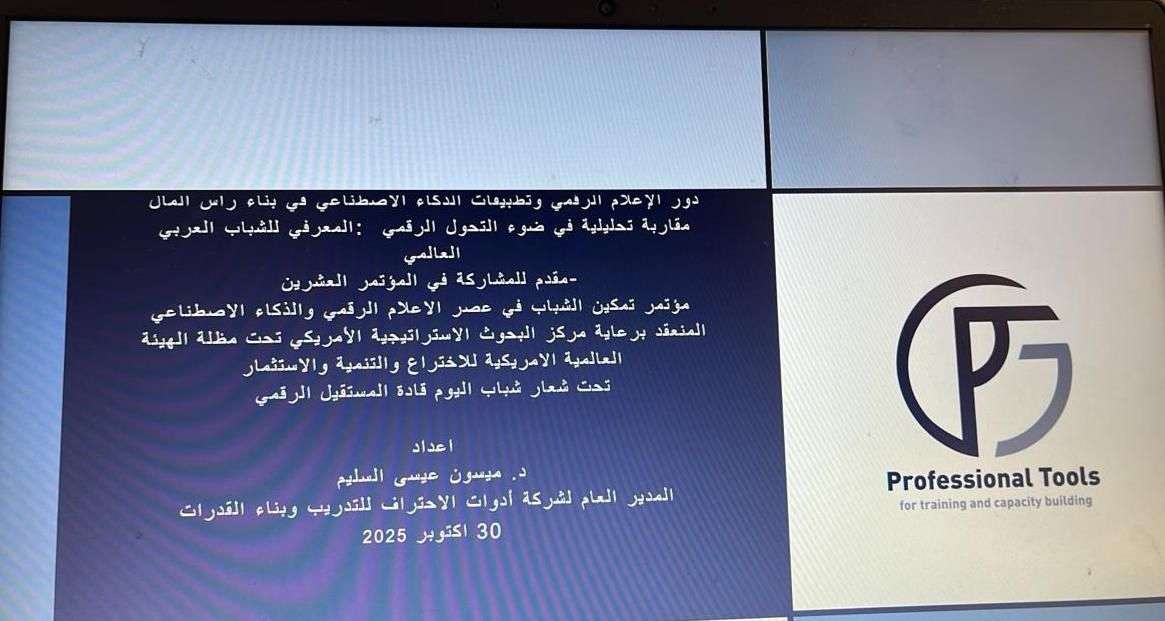وقدّمت الدكتورة ميسون تليلان مشاركة بحثية بعنوان: “دور الإعلام الرقمي والذكاء الاصطناعي في تعزيز رأس المال المعرفي لدى الشباب العربي”، عالجت فيها مشكلة الفجوة بين الاستخدام الترفيهي للتكنولوجيا والاستخدام المعرفي البنّاء، مؤكدة أهمية توظيف الذكاء الاصطناعي والمنصات الرقمية في تنمية التفكير النقدي وصناعة المعرفة بين الشباب. واستندت الدراسة إلى مجتمع شبابي عربي وعينة مختارة من الخبراء باستخدام أدوات بحثية تضمنت استبانة علمية ومقابلات تحليلية. وكشفت النتائج عن علاقة إيجابية بين التمكين الرقمي وارتفاع القدرة المعرفية لدى الشباب، مقابل قصور في توظيف التقنية في التعلم والإبداع، لتوصي الدراسة بدمج مهارات الإعلام والذكاء الاصطناعي في التعليم، وتعزيز المحتوى العربي المتخصص، ودعم المنصات التي تُحفّز الإبداع وصناعة المعرفة.