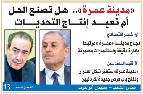 من جانبه قال الخبير الاقتصادي محمد البشير إن الحكومة تُبدي قدراً كبيراً من التفاؤل تجاه مشروع مدينة عمرة، مؤكداً أن الحديث عن إنشاء مدينة جديدة لمعالجة الضغط السكاني والخدماتي على العاصمة عمّان تكرر مراراً، إلى جانب الضغوط التي تعيشها مدن أخرى مثل إربد والزرقاء.