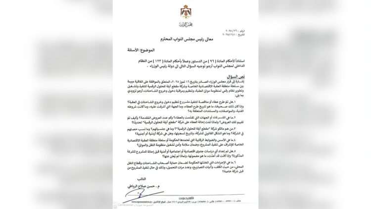 وجه النائب عن محافظة العقبة حسن الرياطي سؤالا للحكومة حول عطاء دخول وخروج الشاحنات والأسس التي تم عليها طرح العطاء