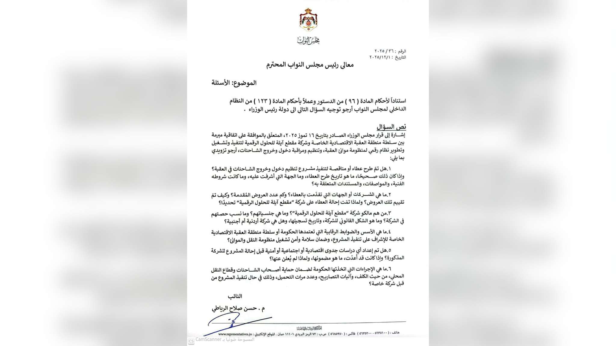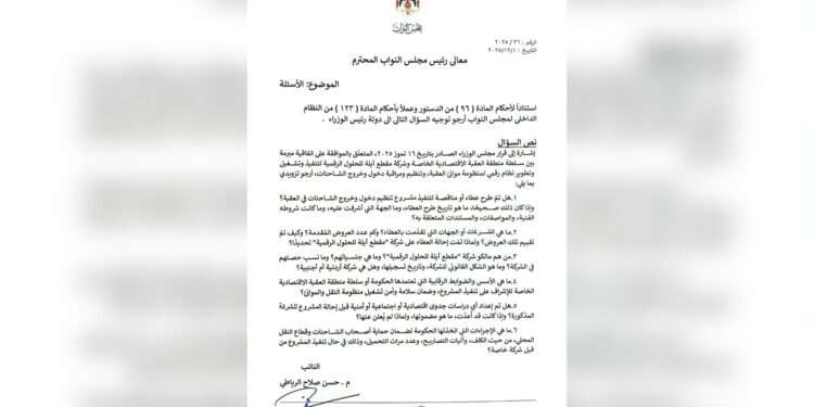 وجه النائب عن محافظة العقبة حسن الرياطي سؤالا للحكومة حول عطاء دخول وخروج الشاحنات والأسس التي تم عليها طرح العطاء