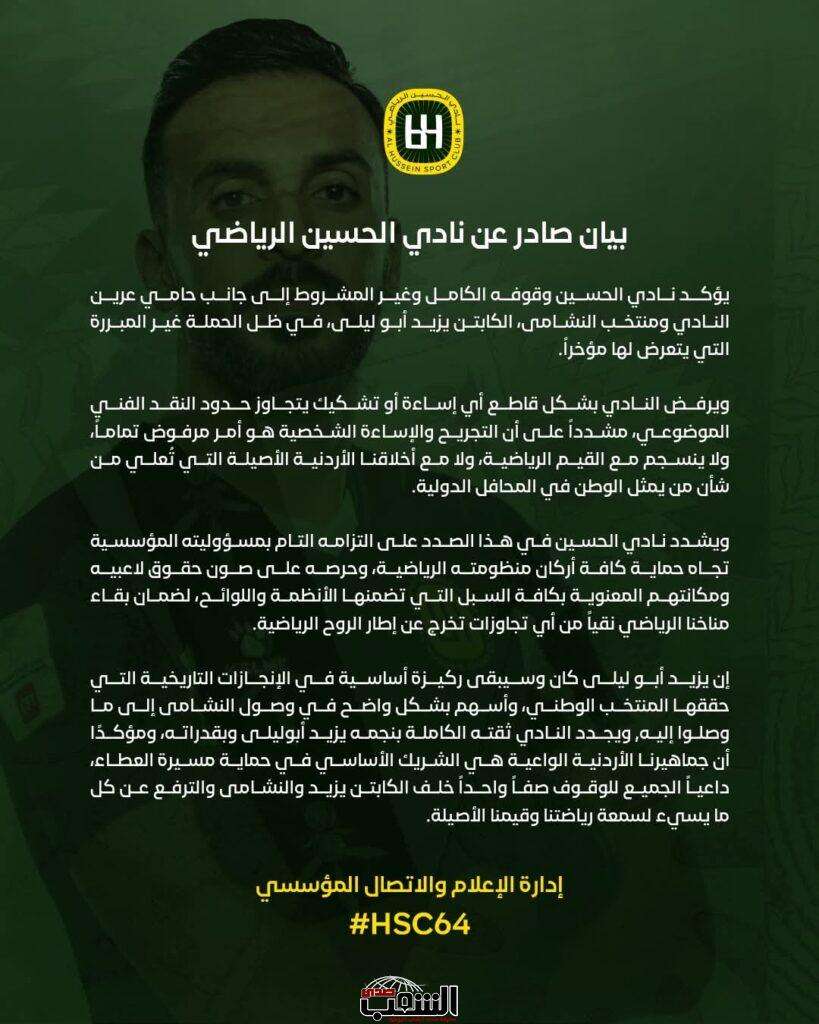 صدى الشعب – أصدر نادي الحسين إربد بيانا قال فيه إنه يقف مع اللاعب يزيد أبو ليلى ضد حملة يتعرض لها.