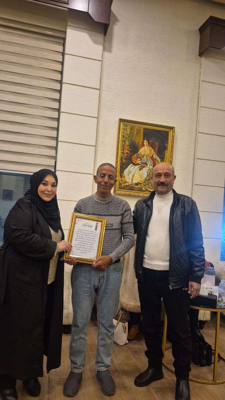وقدم التكريم ممثل اتحاد التراثيين، السيد جميل أبو خلف، إلى جانب رئيس لجنة التراث والفلكلور الأستاذ عامر عواودة، وذلك بتنظيم من الاتحاد العام للتراثيين العرب في الداخل الفلسطيني ولجنة التراث في رابطة الأدباء والمثقفين العرب.