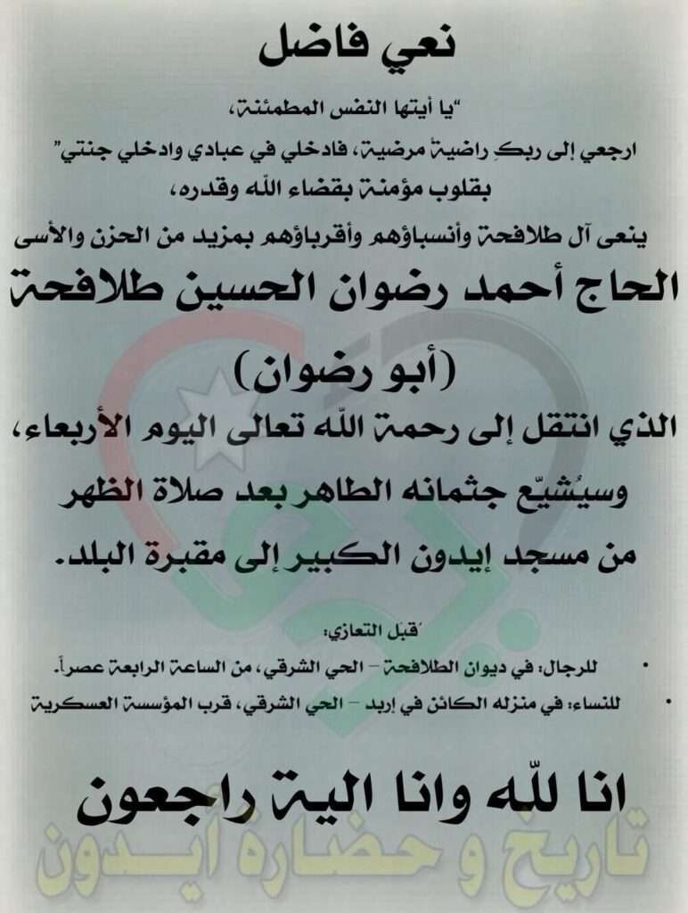 وشُيع جثمانه الطاهر بعد صلاة ظهر اليوم الاربعاء من مسجد ايدون الكبير إلى مقبرة البلدة.