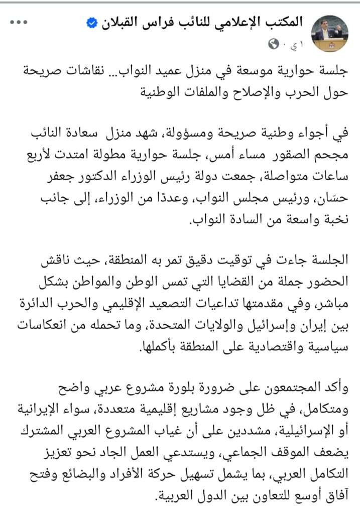 صدى الشعب – نشر النائب فراس القبلان عبر صفحته الرسمية صورة من العشاء و الجلسة التي حضرها رئيس الوزراء، الدكتور جعفر حسان في منزل النائب مجحم الصقور، وكتب التالي .. “جلسة حوارية موسعة في منزل عميد النواب… نقاشات صريحة حول الحرب والإصلاح والملفات الوطنية” :