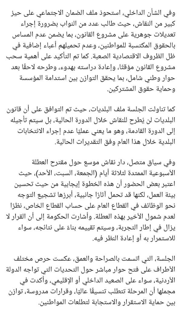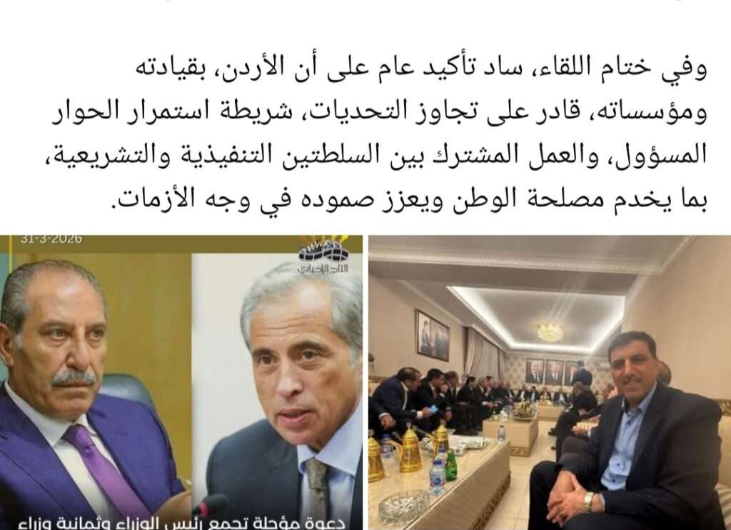 وفي ختام اللقاء، ساد تأكيد عام على أن الأردن، بقيادته ومؤسساته، قادر على تجاوز التحديات، شريطة استمرار الحوار المسؤول، والعمل المشترك بين السلطتين التنفيذية والتشريعية، بما يخدم مصلحة الوطن ويعزز صموده في وجه الأزمات.