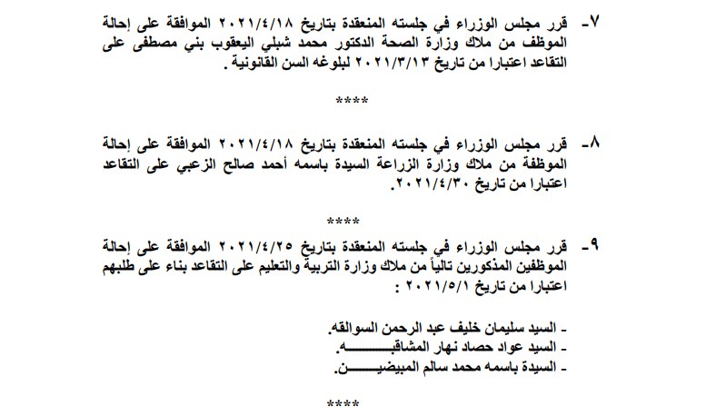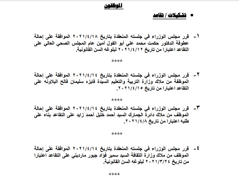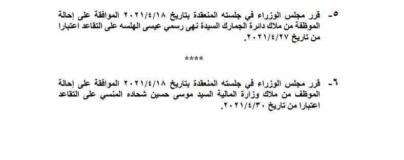 <div class="uk-article-lead uk-text-large uk-text-justify"> <div> <div class="uk-article-lead uk-text-large uk-text-justify"> قرر مجلس الوزراء إحالة موظفين في عدد من الوزارات والدوائر إلى التقاعد. <div></div> <div>وتاليا الاسماء:</div> <div></div> <div class="uk-thumbnail"><img src="https://www.alsaa.net/upload/58e6b8ee478fc4a86ea576d6fb6ead96.jpg" alt="" /> <div class="uk-thumbnail-caption"></div> </div> <div class="uk-thumbnail"><img src="https://www.alsaa.net/upload/58e6b8ee478fc4a86ea576d6fb6ead961.jpg" alt="" /> <div class="uk-thumbnail-caption"></div> </div> <div class="uk-thumbnail"><img src="https://www.alsaa.net/upload/58e6b8ee478fc4a86ea576d6fb6ead9612.jpg" alt="" /> <div class="uk-thumbnail-caption"></div> </div> <div class="uk-thumbnail"><img src="https://www.alsaa.net/upload/58e6b8ee478fc4a86ea576d6fb6ead96123.jpg" alt="" /> <div class="uk-thumbnail-caption"></div> </div> </div> <ins class="adsbygoogle" data-ad-client="ca-pub-1906164944336302" data-ad-slot="4722447476" data-ad-format="auto" data-adsbygoogle-status="done"><ins id="aswift_2_expand" tabindex="0" title="Advertisement" aria-label="Advertisement"><ins id="aswift_2_anchor"></ins></ins></ins> <hr /> <div id="sp-wi-5440" class="speakol-widget loaded"> <div class="spk-header sp-mobile ">قد يعجبك ايض</div> </div> </div> </div>