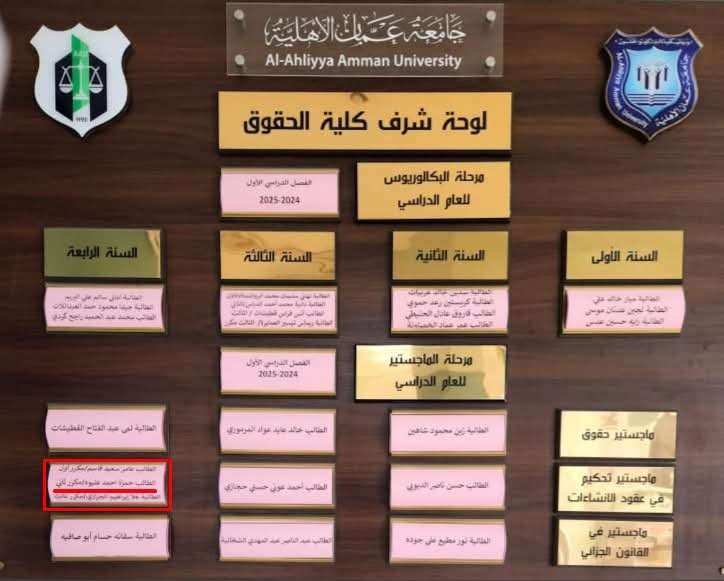 صدى الشعب- بكل فخر واعتزاز، نبارك لأخي الغالي حمزة عليوة (أبو أحمد) ورود اسمه في لوحة الشرف لكلية الحقوق في جامعة عمّان الأهلية – درجة الماجستير.