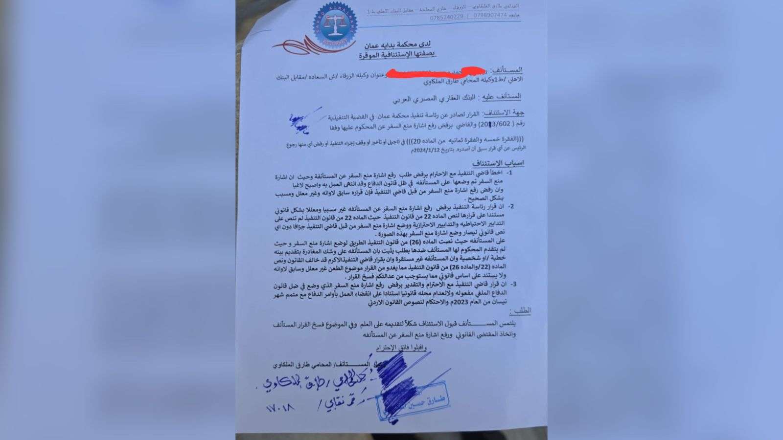 وجاء القرار بعد استئناف قدمه المحامي طارق الملكاوي، الذي أوضح أن المحكمة أخذت بعين الاعتبار انتهاء العمل بقانون الدفاع، وغياب أي مسوغات قانونية تُجيز منع السفر في الحالة المستأنفة، إضافة إلى تأكيدها على ضرورة التزام الجهات القضائية بنصوص قانون التنفيذ، خاصة ما ورد في المادة 26 بشأن اشتراط توافر مبررات قانونية واضحة لمنع السفر.