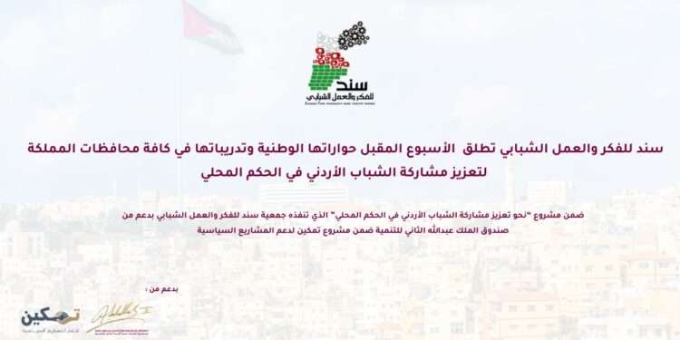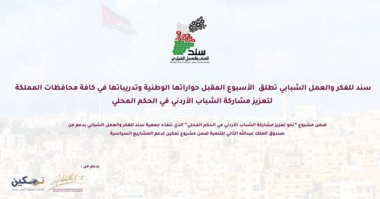 أعلنت جمعية سند للفكر والعمل الشبابي عن إطلاق برنامجها الوطني الشامل لتعزيز مشاركة الشباب الأردني في منظومة الحكم المحلي، في خطوة تهدف إلى تمكين الجيل الجديد من الانخراط الفاعل في العملية الديمقراطية والمساهمة في مسارات التنمية المحلية.