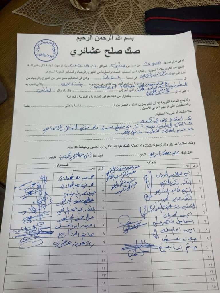 صدى الشعب – قاد الشيخ عبدالكريم الحويان مساء اليوم صلح عشائري بين عشيرةالهملان والشيخ فايزالظهراوي وذلك في مركز أمن المقابلين على إثر مشاجرة وقعت مساء أمس الاثنين في المنطقة. وتم كتابة صك الصلح والتوقيع عليه ضمن الشروط التالية :-