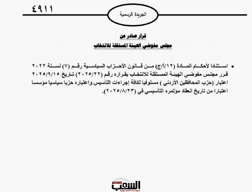 صدر في عدد الجريدة الرسمية الأربعاء، قرار مجلس مفوضي الهيئة المستقلة للانتخاب باعتبار حزب المحافظين الأردنين مستوفيًا لإجراءات التأسيس كافة واعتباره حزبًا سياسيًا مؤسسًا اعتبارًا من تاريخ انعقاد مؤتمره التأسيسي في 23 آب 2025. وتاليًا نص القرار: