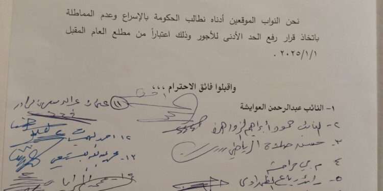 طالب عدد من النواب ضمن مذكرة نيابية تبناها النائب عبد الرحمن العوايشة، اليوم الاثنين، الحكومة إلى الإسراع وعدم المماطلة باتخاذ قرار رفع الحد الأدنى للأجور، اعتبارًا من مطلع العام المقبل 2025.