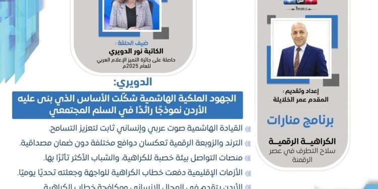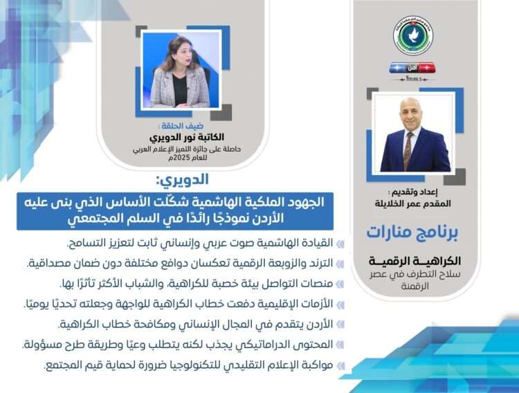 صدى الشعب – في حلقة جديدة من برنامج منارات، والتي تبث عبر أثير إذاعة أمن أف أم، استضاف المقدم عمر الخلايلة الكاتبة نور الدويري – الحاصلة على جائزة التميز في الإعلام العربي للعام 2025م – للحديث حول موضوع: “الكراهية الرقمية: سلاح التطرف في عصر الرقمنة”.