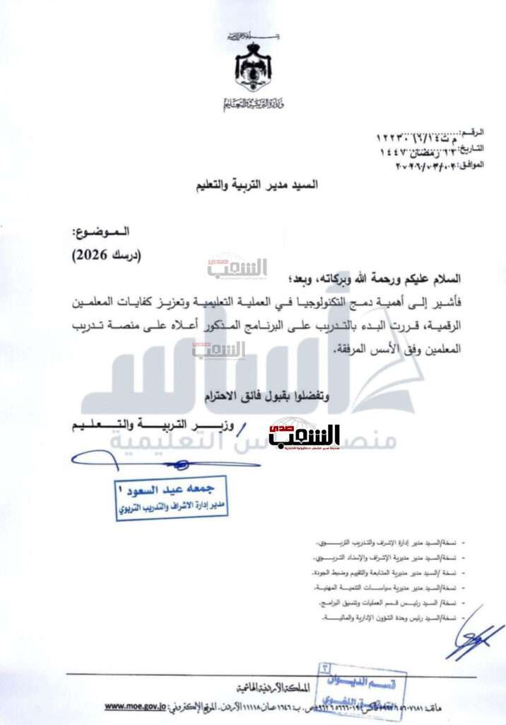 وبحسب الكتاب، فقد دعت الوزارة إلى رفع مستوى الجاهزية الفنية والتنظيمية، والتأكد من تحديث بيانات الطلبة والمعلمين، ومراجعة خطط التعليم الإلكتروني، وضمان جاهزية المنصات المعتمدة تحسبًا لأي مستجدات قد تستدعي تفعيل هذا النمط من التعليم.