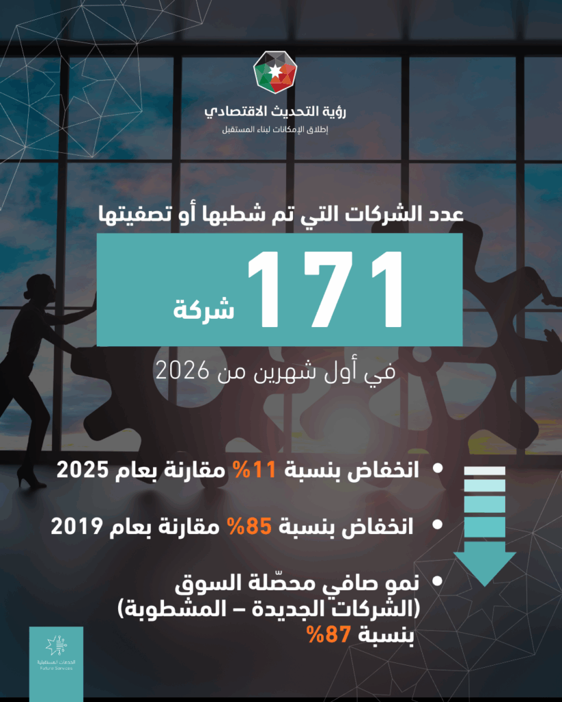 وانخفض عدد الشركات التي تم فسخ أو شطب تسجيلها بنسبة 85 بالمئة عن نفس الفترة من 2019، حيث شطبت أو فسخت 171 شركة تسجيلها، بدلا من 1149 شركة خلال 2019، وبنسبة 11 بالمئة عن أول شهرين من العام الماضي، وبعدد 193 شركة.
