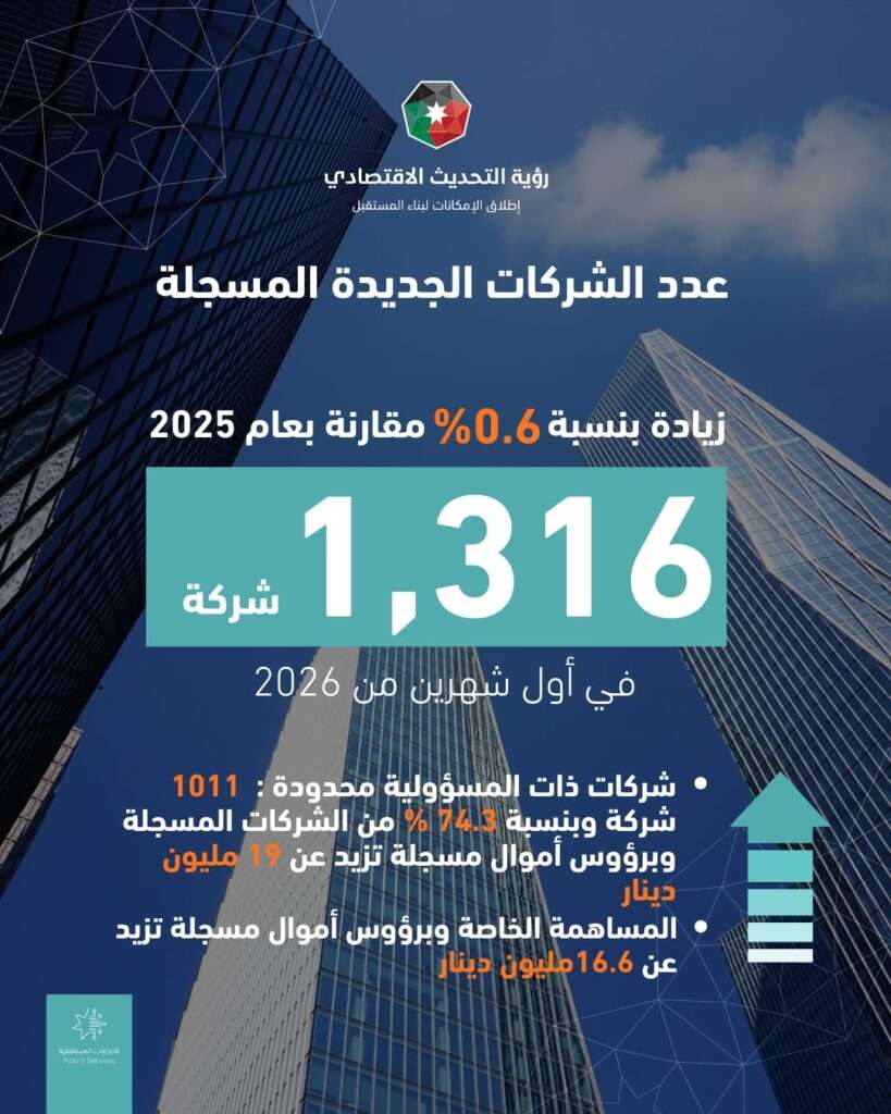 صدى الشعب – ارتفع عدد الشركات المسجلة في المملكة، في أول شهرين من العام الحالي، بنسبة 35 بالمئة، مقارنة مع الفترة نفسها من عام 2019، و0.6 بالمئة عن نفس الفترة من 2025.