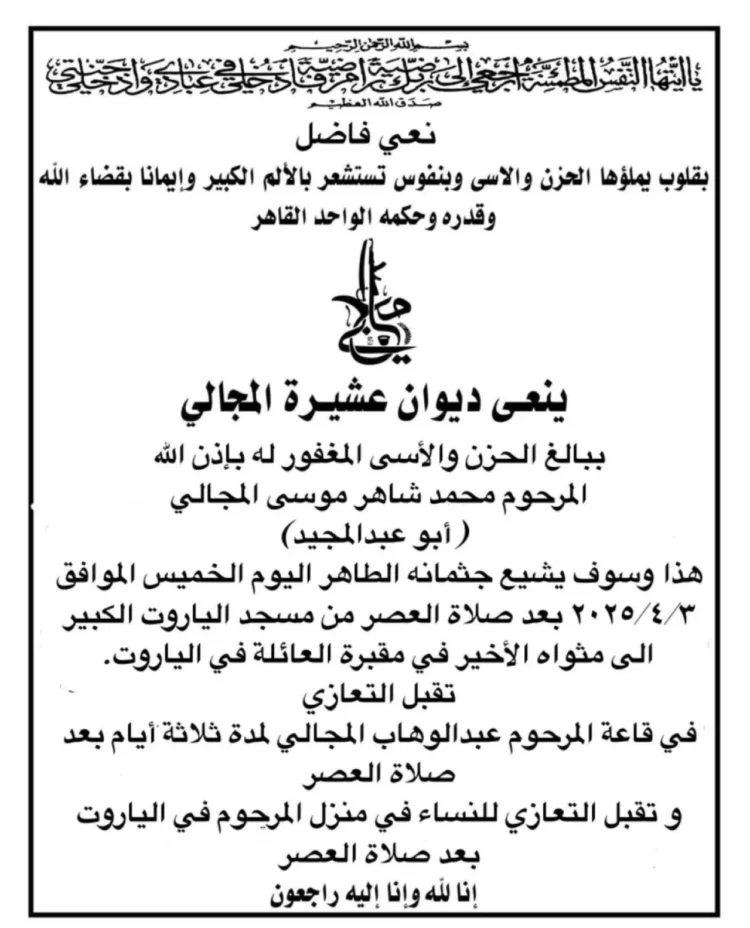 صدى الشعب –  ((يَا أَيَّتُهَا النَّفْسُ الْمُطْمَئِنَّةُ ارْجِعِي إِلَى رَبِّكِ رَاضِيَةً مَرْضِيَّةً فَادْخُلِي فِي عِبَادِي وَادْخُلِي جَنَّتِي)) صدق الله العظيم. انتقل الى رحمه الله تعالى الحاج محمد شاهر المجالي ” ابو عبدالمجيد” سائلين المولى عز وجل ان يتغمده بواسع رحمته ويسكنه فسيح جناته ويلهم اهله وذويه الصبر والسلوان.