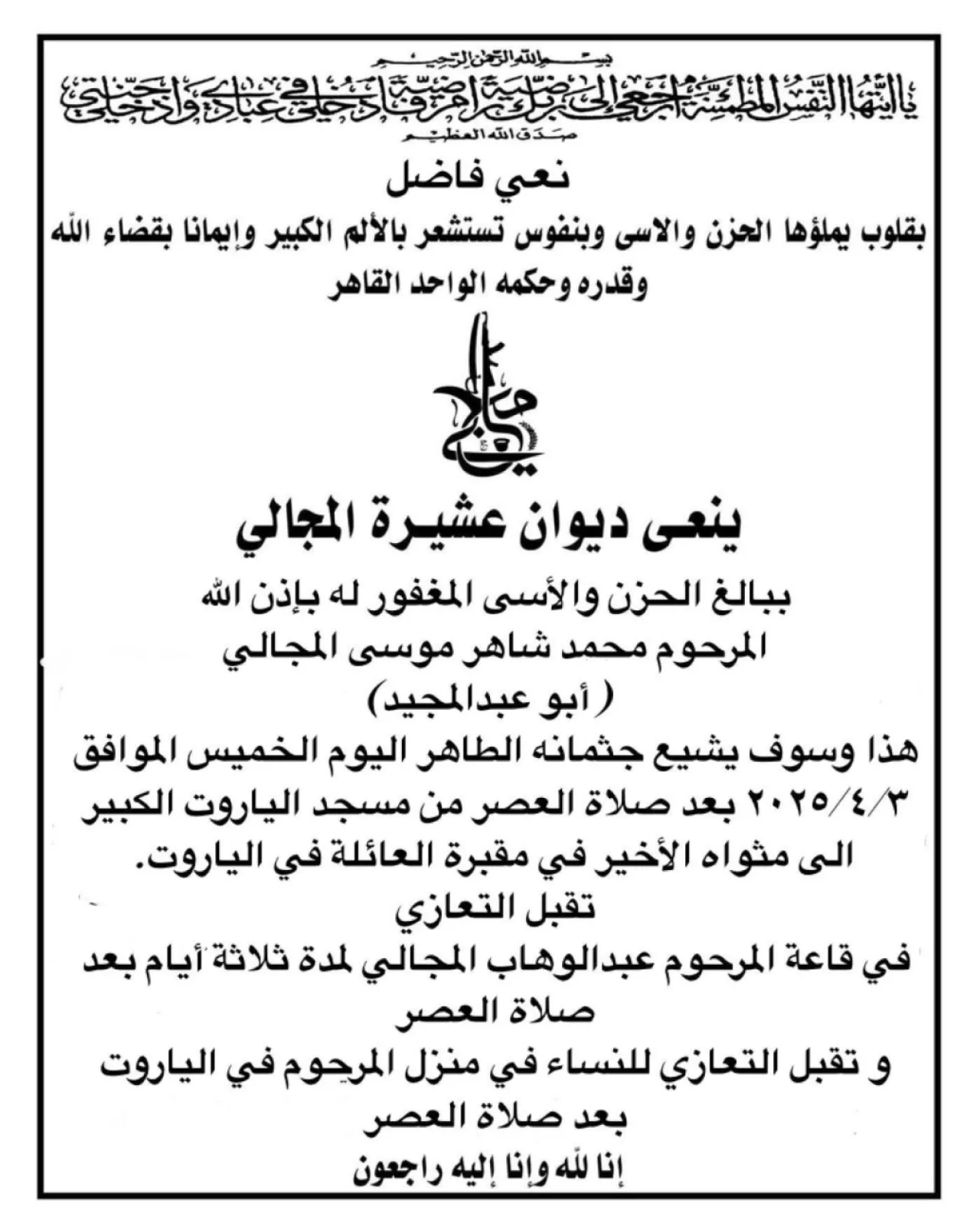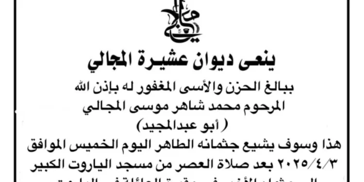 صدى الشعب –  ((يَا أَيَّتُهَا النَّفْسُ الْمُطْمَئِنَّةُ ارْجِعِي إِلَى رَبِّكِ رَاضِيَةً مَرْضِيَّةً فَادْخُلِي فِي عِبَادِي وَادْخُلِي جَنَّتِي)) صدق الله العظيم. انتقل الى رحمه الله تعالى الحاج محمد شاهر المجالي ” ابو عبدالمجيد” سائلين المولى عز وجل ان يتغمده بواسع رحمته ويسكنه فسيح جناته ويلهم اهله وذويه الصبر والسلوان.