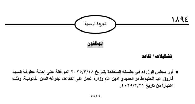 صدى الشعب – قرر مجلس الوزراء في جلسته المنعقدة بتاريخ 2025/3/18 الموافقة على إحالة فاروق عبد الحليم طاهر الحديدي، أمين عام وزارة العمل إلى التقاعد، لبلوغه السن القانونية، وذلك اعتباراً من تاريخ 2025/3/21، كما انفردت (صدى الشعب) في مقال ٍ سابق.