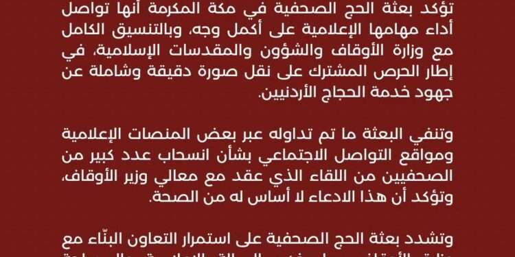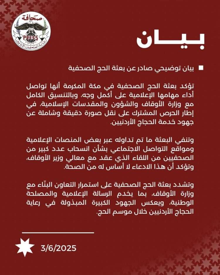 وتشدد بعثة الحج الصحفية على استمرار التعاون البنّاء مع وزارة الأوقاف، بما يخدم الرسالة الإعلامية والمصلحة الوطنية، ويعكس الجهود الكبيرة المبذولة في رعاية الحجاج الأردنيين خلال موسم الحج.
