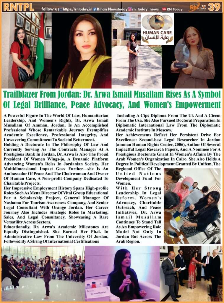 صدى الشعب – تعتبر الدكتورة أروى إسماعيل مسلم، الشخصية البارزة في عالم القانون والقيادة الإنسانية وحقوق المرأة من عمان، الأردن، محترفة بارزة ذات مسيرة مهنية متميزة تجسد التفوق الأكاديمي والنزاهة المهنية والالتزام الثابت بتحسين المجتمع.