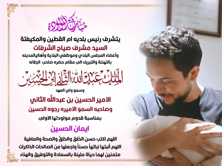 صدى الشعب – يرفع رئيس بلدية أم القطين والمكيفتة السيد مشرف صياح الشرفات وأعضاء المجلس البلدي وموظفي البلدية إلى مقام حضرة صاحب السمو الملكي الأمير الحسين بن عبدالله الثاني، ولي العهد، وصاحبة السمو الملكي الأميرة رجوة الحسين، أسمى آيات التهنئة بمناسبة قدوم مولودتهما الأولى الأميرة إيمان بنت الحسين.
