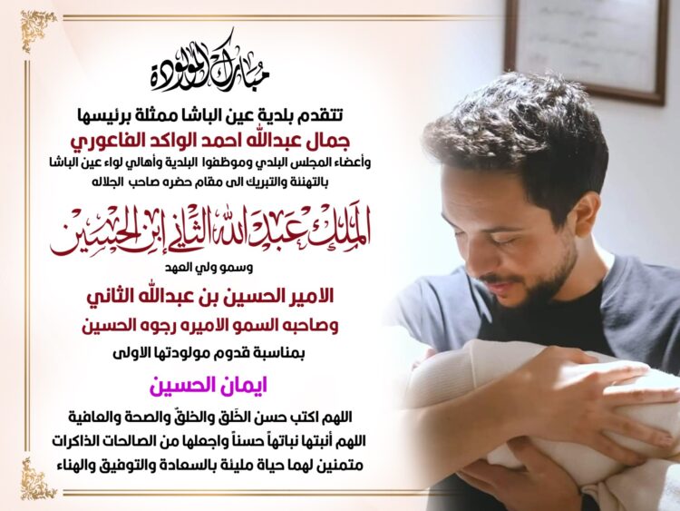 يتقدم جمال الواكد الفاعوري رئيس بلدية عين الباشا الجديدة واعضاء المجلس البلدي والموظفين بأسمى آيات التهاني والتبريكات لحضرة صاحب الجلالة الهاشمية الملك عبدالله الثاني ابن الحسين ولجلالة الملكة رانيا العبدالله ولصاحبي السمو الملكي الأمير الحسين بن عبدالله الثاني، ولي العهد، والأميرة رجوة الحسين، وللعائلة الهاشمية بمناسبة قدوم الأميرة إيمان بنت الحُسين