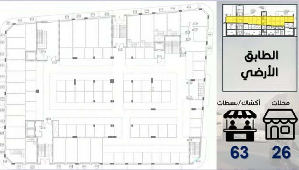 الطابق الأرضي: يحتوي على العدد الأكبر من البسطات والمخازن على الواجهتين الشمالية والشرقية، إلى جانب ثلاثة مداخل رئيسة من الشوارع الشرقية والجنوبية والغربية بعروض قابلة للتوسعة، إضافة إلى أدراج داخلية وخارجية وخامس درج طوارئ في الجهة الجنوبية.