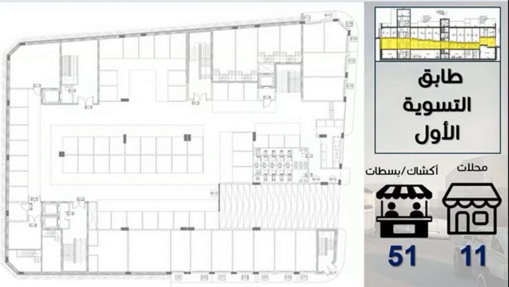 طابق التسوية الأولى: يضم بسطات داخلية ومخازن وحمامات عامة ومدخلا رئيسا بعرض 2.85 متر مخصص لدخول مركبات الخضار، إضافة إلى مداخل من الجهات الجنوبية والشرقية والغربية مرتبطة بالطابق الأرضي، مع درج طوارئ وأربعة مصاعد.