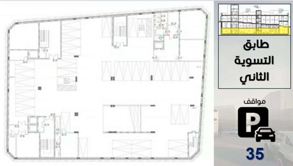طابق التسوية الثانية (القبو): يضم مواقف سيارات وخدمات متعددة منها مصلى وحمامات ومكاتب، مع مدخل رئيس للسيارات من الجهة الجنوبية وارتباط مباشر بالطوابق الأخرى عبر أربع مصاعد وأربعة أدراج.