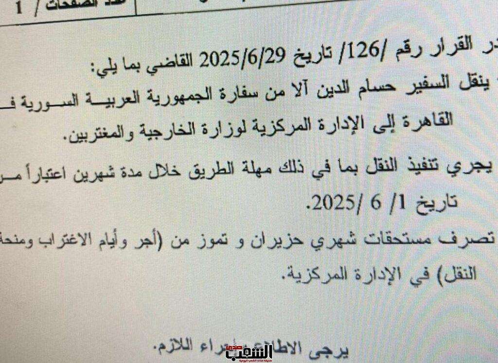 وجاء في نص القرار الصادر عن وزارة الخارجية والمغتربين بتاريخ 29 حزيران/يونيو 2025: “ينقل السفير حسام الدين آلا من سفارة الجمهورية العربية السورية في القاهرة إلى الإدارة المركزية لوزارة الخارجية والمغتربين. يجري تنفيذ النقل بما في ذلك مهلة الطريق خلال مدة شهرين اعتبارا من 1/6/2025”.